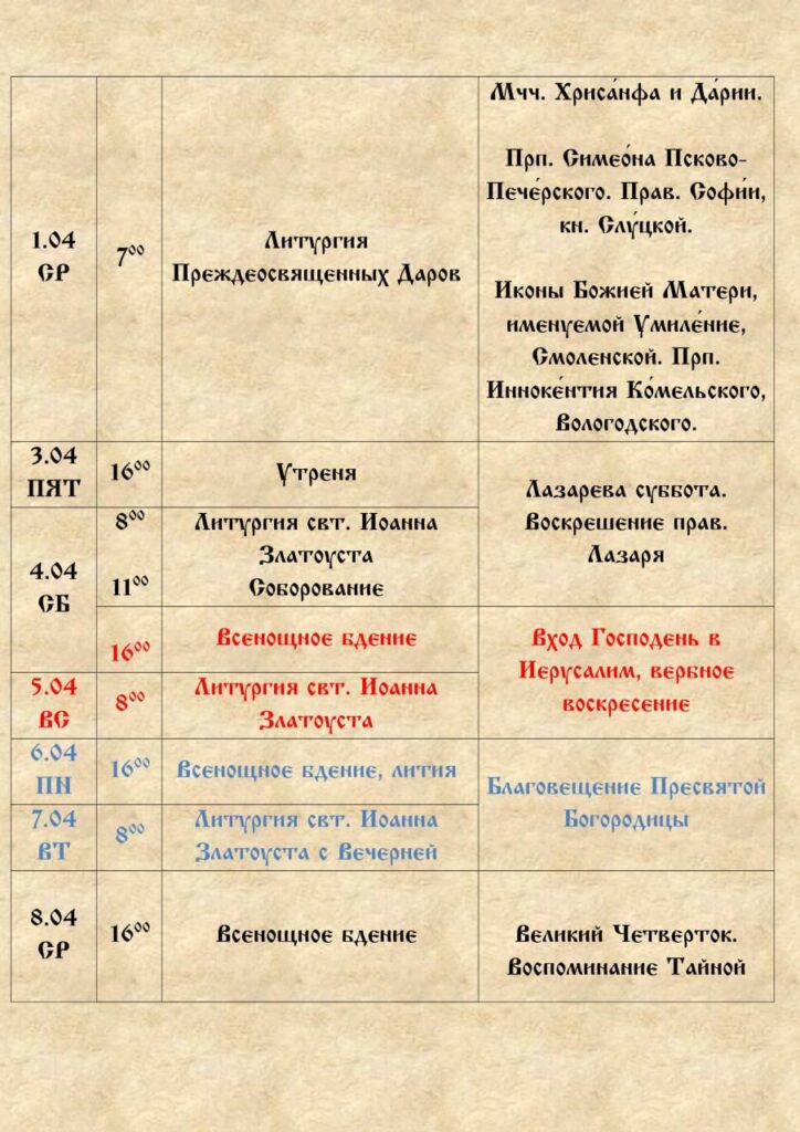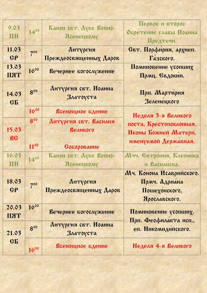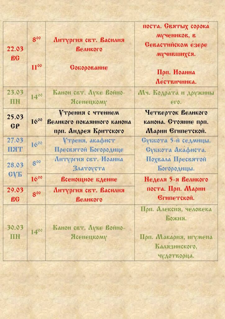Утром 24 февраля в нашем храме была совершена Литургия Преждеосвященных Даров, а вечером — Великое повечерие с чтением Великого покаянного канона преподобного Андрея Критского.