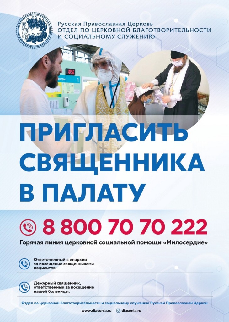 Участники онлайн-совещания обсудили структуру взаимодействия, размещение в медицинских учреждениях информационных листовок «Пригласить священника в палату», где указан номер бесплатной горячей линии церковной социальной помощи «Милосердие» — 8-800-70-70-222. По этому номеру телефона можно звонить из любого региона России даже при нулевом балансе. В листовке также будут указаны телефонные номера епархиального ответственного за посещение священниками пациентов и дежурного священника, ответственного за посещение конкретной больницы. В Саратовской епархии ответственным назначен руководитель епархиального отдела по взаимоотношениям с министерством здравоохранения и медицинскими учреждениями Саратовской области иерей Илия Козлов.