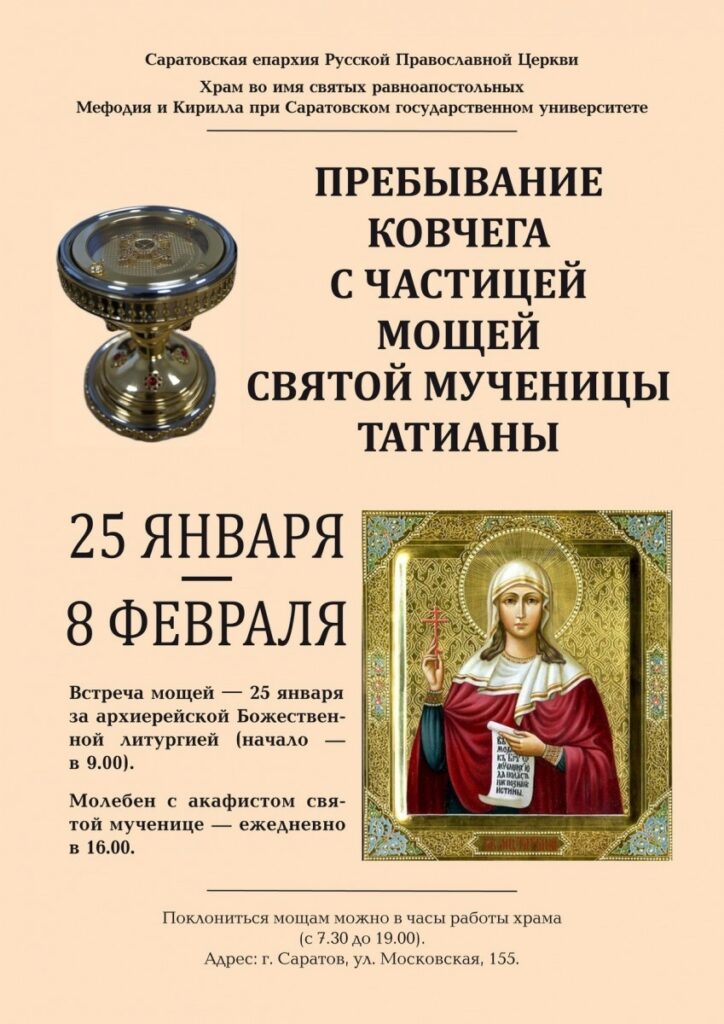 5 января в храм во имя святых равноапостольных Мефодия и Кирилла при Саратовском государственном университете имени Н. Г. Чернышевского был принесен ковчег с частицей мощей мученицы Татианы, покровительницы российского студенчества.
