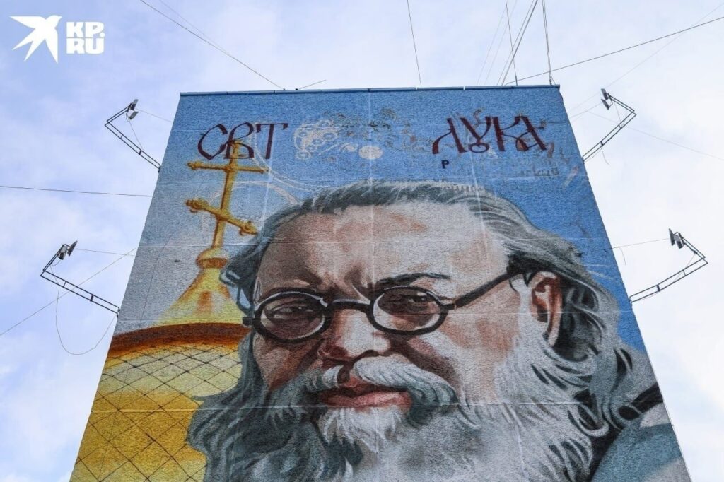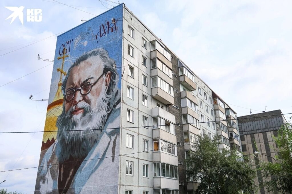 Этот мурал расположен рядом с Красноярским медицинским университетом, названным в честь профессора В. Ф. Войно-Ясенецкого, известного как святитель Лука.